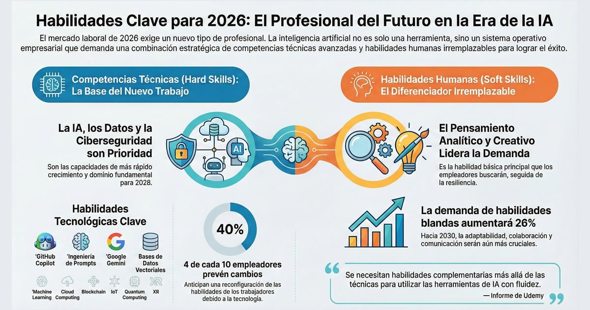 En 2026, las empresas priorizan cursos de fluidez en IA, gobernanza de inteligencia artificial y pensamiento crítico. Certificaciones como AWS Certified Data Engineer y CISSP son esenciales, junto con habilidades adaptativas para orquestar colaboración humano-máquina. La demanda responde a la drástica reducción de la vida media de competencias técnicas y la necesidad de resiliencia organizacional frente a la automatización masiva.